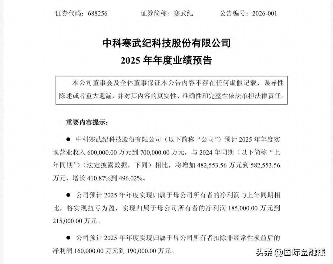 1月30日晚间,中科寒武纪科技股份有限公司(下称“寒武纪”)披露2025年年度业绩预告,经财务部门初步测算,公司预计2025年年度实现营业收入60亿到70亿元,与上年同期相比,增长410.87%到496.02%。
